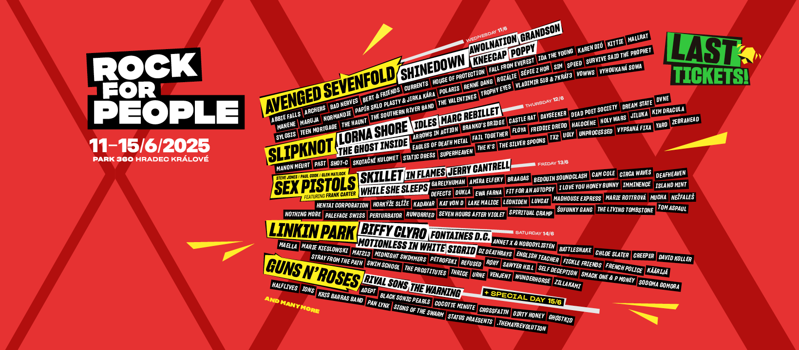 Rock for People slaví třicítku a bude to fakt velký!Festival se vrací do hradeckého Parku 360 od 11. do 15. června 2025 a čeká se až 50 tisíc lidí. Finální lineup je venku – a je to jízda. K hvězdám