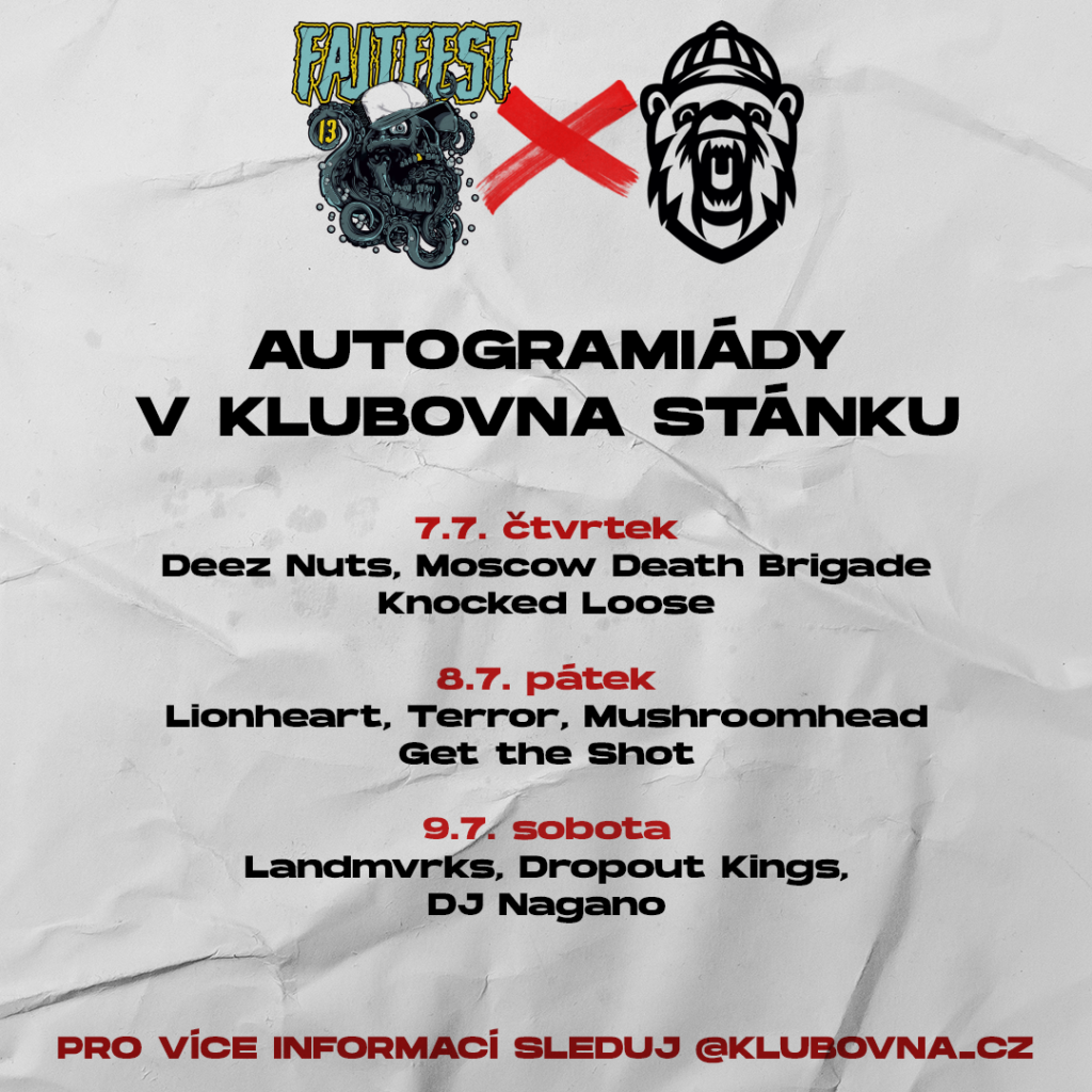 Náš stánek bude překypovat aktivitou i vzácnými hosty, a to rovnou s headlinery celého festivalu, kteří se Vám rádi podepíší nebo se s Vámi vyfotí! Postupně se za námi zastaví například Deez Nuts, Knocked Loose, Get The Shot nebo Moscow Death Brigade!