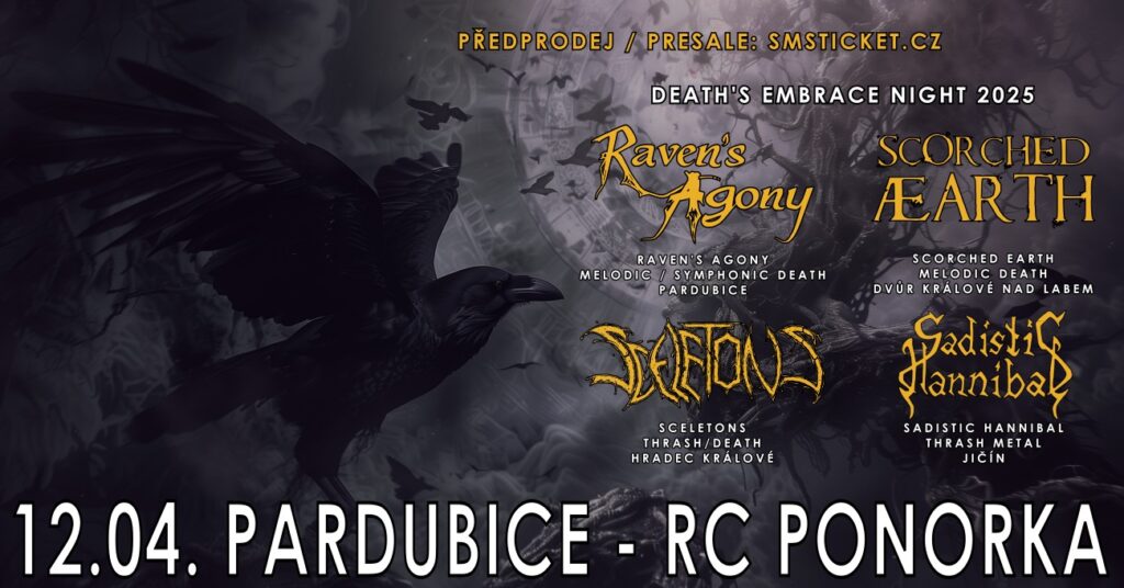 A v nových, slibně znějících sériích pokračujeme v Pardubicích, kde se tentokrát mohou radovat fanoušci metalu. Zdejší melodic deathmetaloví Raven’s Agony přichází s prvním ročníkem Death’s Embrace Night propojujícím čtyři kapely východočeské scény, které se do toho nebojí řezat. V line-upu se dále můžete těšit na thrash-metalové Sadictic Hannibal vyzbrojené čerstvým albem Svátost bolesti i rozšířenou sestavou, veterány české metalové scény mixující thrash s death metalem SCELETONS a osobitý melodický death metal Scorched Æerth inspirovaný severskou epikou.