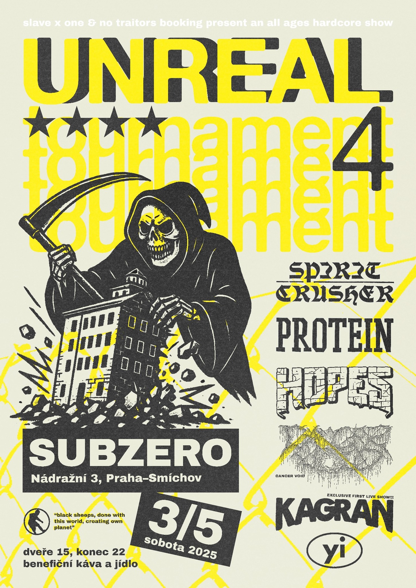 V sobotu bude v Praze krušno nejen na Štvanici, ale také ve smíchovském Subzero, kde se v 15 hodin otevřou dveře čtvrté edice Unreal Tournament, sympatické akce z dílny Slave X One DIY shows nabízející kvalitní plejádu z domácích luhů a hájů. V průběhu dne se předvede silná domácí sestava ve složení Hopes, Protein, YI a Kagran. Z Německa navíc dorazí také zástupci svěžího crossover hardcoru, nekompromisní Spirit Crusher.