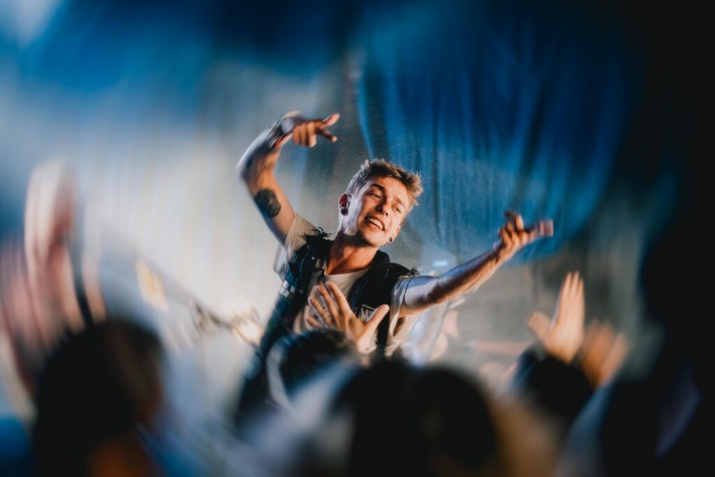 Naspořená energie se rozhodně hodila v případě jedné z těch možná nejzábavnějších shows, o kterou se postarali nezastavitelní zebrahead – dokonalý punkrockový cirkus, který obsahoval bar na stagi, plavbu na nafukovacích melounech a spoustu dalších momentů, které by dalo zabrat stíhat i někomu s ADHD. Tahle show nenudila ani na vteřinu, dokonale sedla festivalovém vibu a byla takovou skatepunkovou verzí Brat summer, přesněji zebrahead summer. Následoval náš další „mini headliner“, Trophy Eyes, kteří si bohužel vysloužili asi nejhorší zvuk festivalu. I za cenu odpálených ušních bubínků jsme ale brali přední pozice, protože tohle je prostě srdcovka. Samotné kapele se nic vyčíst nedá, nasazení 10/10… a díky Flešovi za SCOOP bylo i koho chytat. Část redakce se ale bohužel musela před koncem setu utrhnout na Terror. Legendy nasadily tempo, které by setřáslo většinu generačních následovníků, a o jejich odkazu se ani nemá cenu bavit. V moshi to byla 100% pozitivní agrese a tenhle vlak nešlo zastavit. Další moment, kdy letošní Mocné zvuky gradovaly.