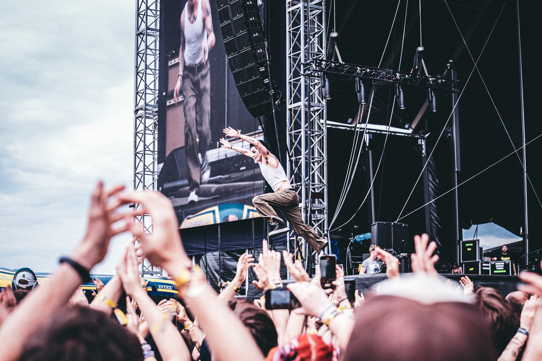 S: Jo, hráli jsme na Greenfieldu. Hrajeme Greenfield Festival, děláme interview a ptají se nás: „Vy se prostě dotknete každého místa na stagi.“ A pak: „Ještě jsem neviděla žádnou kapelu, co by to dělala.“ A já říkám: „A proč ne?“ Jakože, lidi se chtějí bavit. Je důvod, proč se tomu říká „živá zábava“. Lidi nechtějí jen poslouchat blbou nahrávku. Chtějí sledovat „živou zábavu“.
