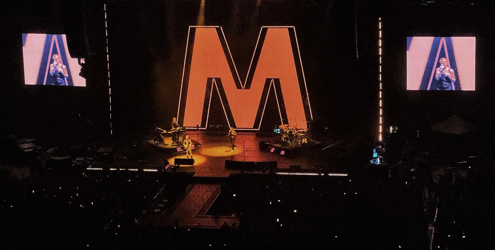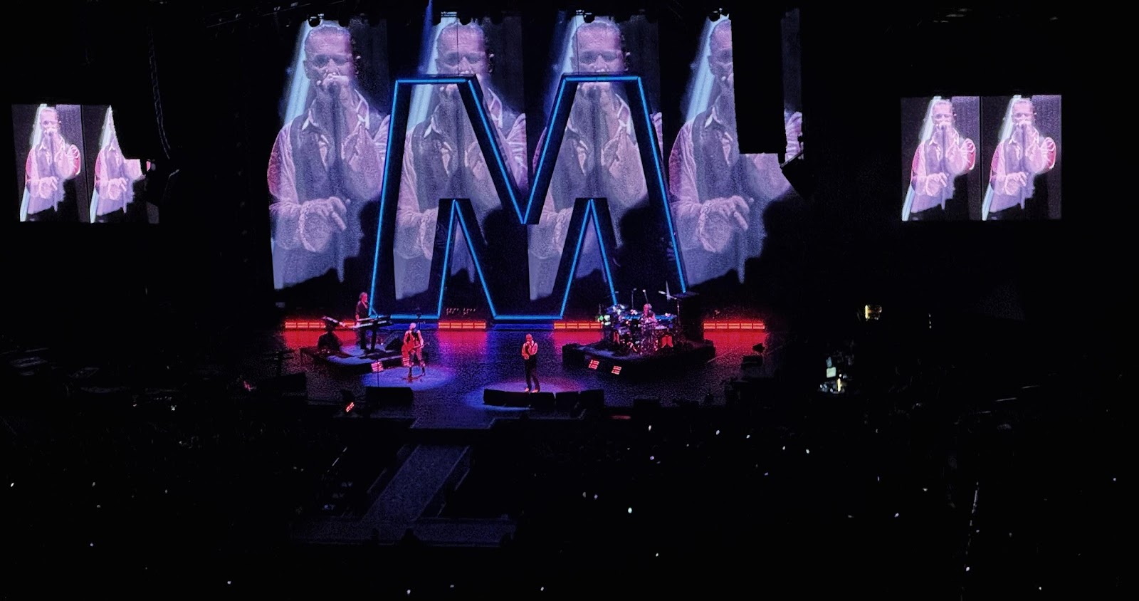 Monstrózní stage se pomalu probouzí a na pódium přichází členové skupiny. Posléze za velkých ovací dorazí i zpěvák Dave Gahan a show začíná! Během úvodní písně „My Cosmos Is Mine“ se vybarvuje obří logo ve tvaru M a Depeche Mode hned od začátku potvrzují, v čem je jejich silná stránka. Chytlavé melodie, z čehož vesměs „co song, to hit“, a výborný stage design! Jak dokázali nacpat tak velkou LED obrazovku do O2 areny? To by mě zajímalo! Takže vše, co kapela představila na letní show, máme pod střechou a ještě díky okamžité tmě s lepšími vizuálními efekty! A to nejdůležitější? Zvuk v O2 areně je někdy postrach vystoupení, ale na místech, kde jsem seděl, bylo vše v naprostém pořádku.