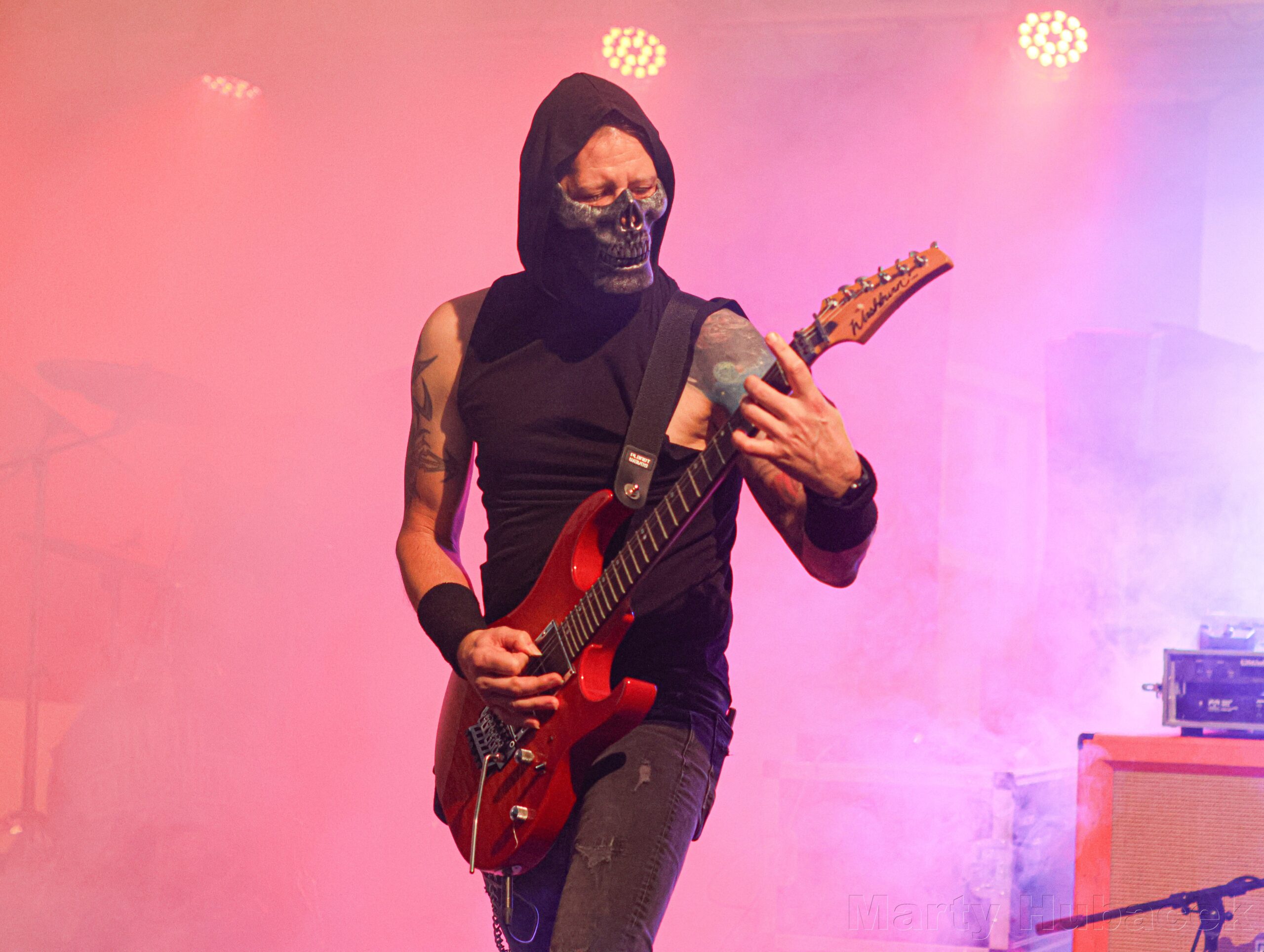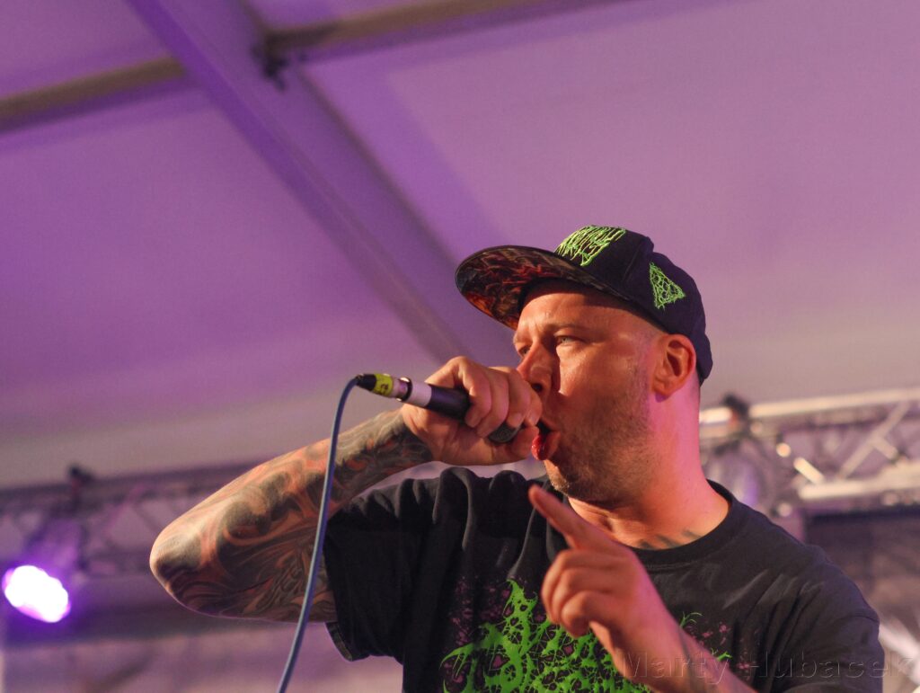 My přišli do areálu v sobotu po 17. hodině a po krátké aklimatizaci jsme se vydali na první kapelu. Tou byli legendární čeští grindcoristé Fleshless. Staří pardálové, kteří mají pořád co říci a jejichž show příjemně utekla. Líbilo se mi střídání pasáží, střední growl a ukvičené části, které jsou charakteristické pro tenhle hudební styl. Po nich hrála jedna z mála negrindových kapel, rakouští Darkfall. Znělo to jako death metal s hlavní a doprovodnou kytarou, který je smíchaný s dalšími styly. Kytarista hrající na hlavní kytaru měl masku na obličeji – jak řekl jeden kámoš: „Aviana style“. Doprovodná kytara mi chvílemi přišla málo nazvučená a v celkovém zvuku chrčelo v pozadí něco, co tam být nemělo. Škoda, že na ně dorazilo málo posluchačů.